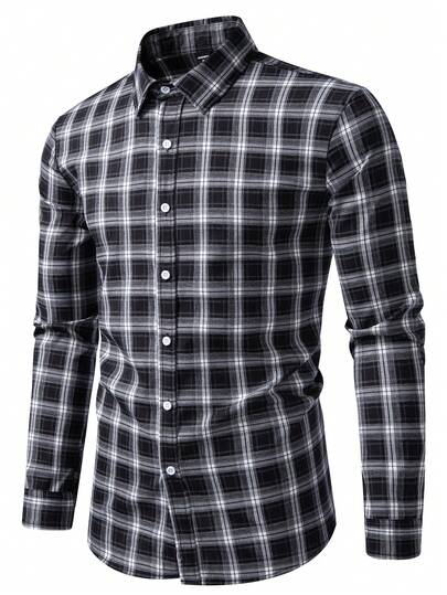 Manfinity Nomadique Men's Plaid Long Sleeve Single-Breasted Casual/Business Shirt Men's Casual Dress Shirt Men Shirts Plaid Black And White Men's Shirt Black And White Dress Shirts For Man Black And White Shirt - Black - View 1