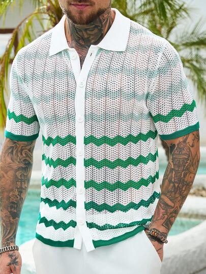 Manfinity RSRT Men's Striped Short Sleeve Front Button Casual Hollow Out Knit Top - White - View 1