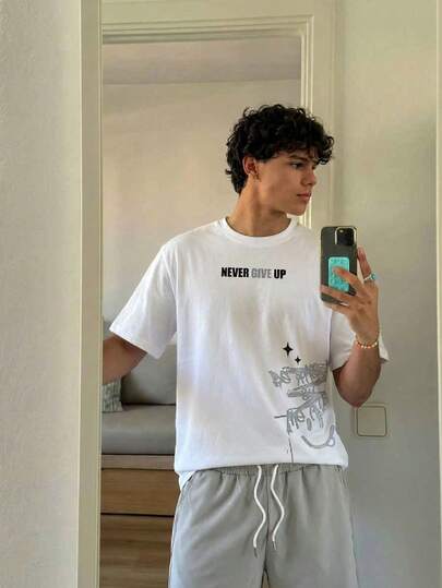 Manfinity Unisex Men's Casual Slogan Print T-Shirt & Solid Drawstring Waist Shorts 2pcs/Set Summer Outfit, Couple Things - Grey - View 5