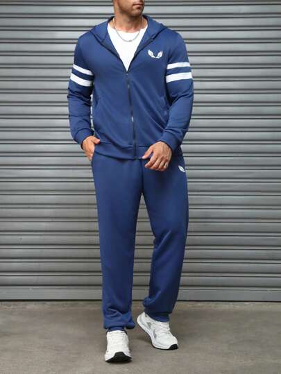 Manfinity Homme Men's Striped Eagle Print Zip-Front Hooded Sweatshirt And Pants Casual Tracksuit Spring & Autumn - Navy Blue - View 1