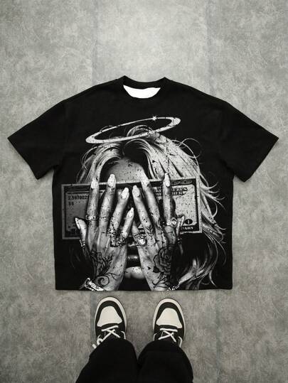 Manfinity Roghcode Men's Distressed Angel Face Money Print T-Shirt, Street Style Graphic Tees Men Graphic Tshirts - Black - View 1