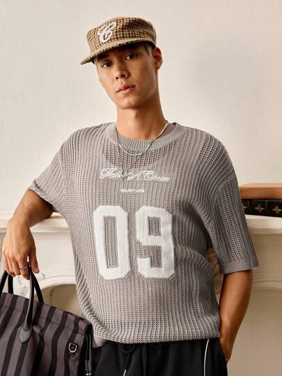 Manfinity VCAY Men's Summer Casual Letter & Number Pattern Hollow Knitted Short Sleeve Top - Khaki - View 1