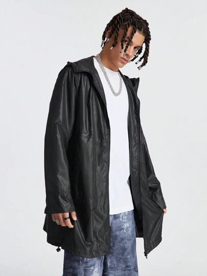 Manfinity VCAY Men's Waterproof Long Hooded Plain Grunge Trench Coat With Long Sleeves, For Fall Winter - Black - View 1