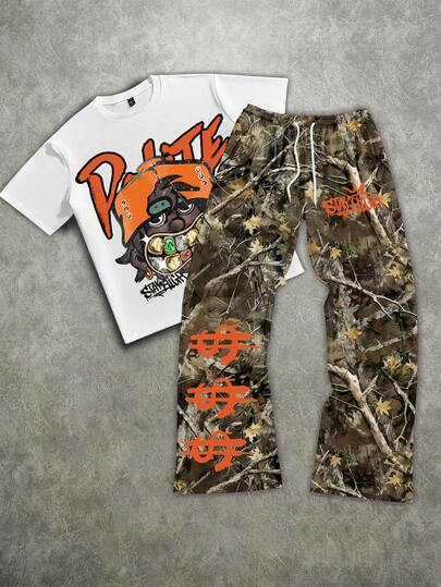 Manfinity ZONE917 Plus Size Loose Street Style Camouflage, Gem, Cartoon Portrait, Face, Money Print Short Sleeve T-Shirt Set - Multicolor - View 1