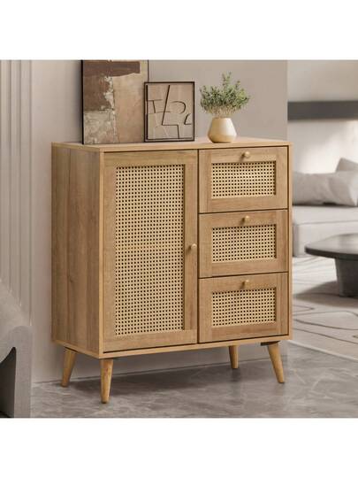 Manila Oak & PVC Rattan Compact 1 Door 3 Drawer Sideboard - Brown - View 1