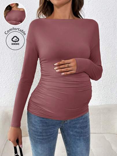 SHEIN Maternity Solid Color Round Neck Drop Shoulder Ruched Fitted Casual Long Sleeve T-Shirt - Dusty Pink - View 1
