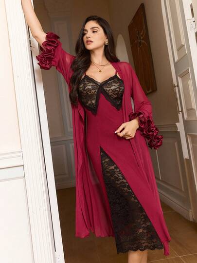 Mature, Sexy, Elegant Lace Patchwork Slip Dress, Mesh Robe, Women Sleepwear Pajama Set - Burgundy - View 1