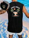 Men's Round Neck Sleeveless Palm Tree & Letter Print Casual Top, Suitable For Vacation