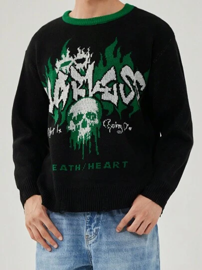 Manfinity Roghcode Men's Solid Color Splice Round Neck Long Sleeve Graphic Detail Simple Casual Sweater - Black - View 1