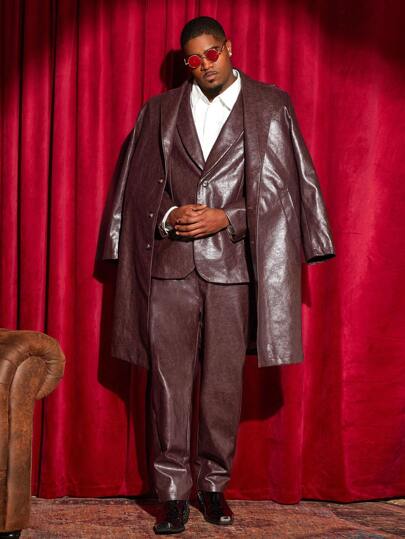 Manfinity VCAY Men's Plus Size Long Leather Jacket, For Fall Winter - Coffee Brown - View 1
