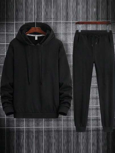 Men's Drawstring Hoodie And Sweatpants Sports Suit, Athletic Suit, Tracksuit - Black - View 1