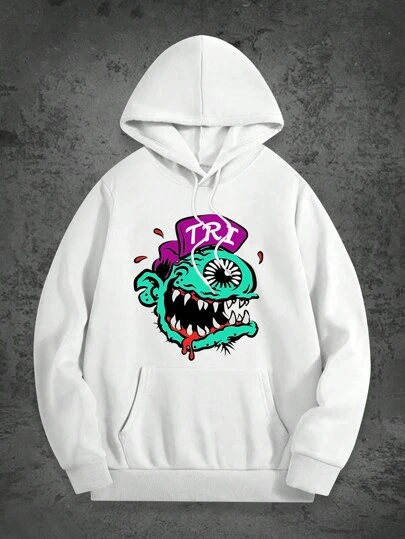 Men's Cartoon  Printed Casual Sports & Commuting Versatile Letter Embroidered White Hoodie Pullover Sweatshirt - White - View 1