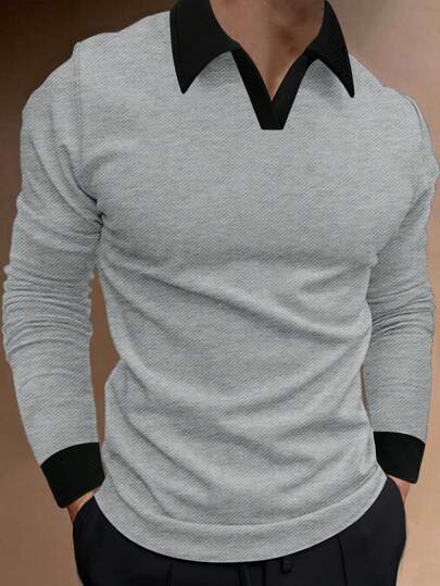 Manfinity Homme Men's Casual Color Block Ribbed Collar Long Sleeve Fleece Polo Shirt - Grey - View 1