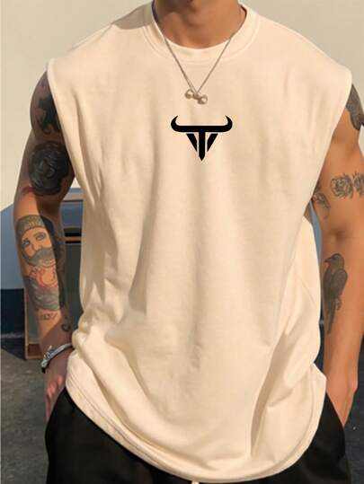 Manfinity Homme Men's Casual Loose Fit Bull Head Graphic Round Neck Tank Top - Khaki - View 1
