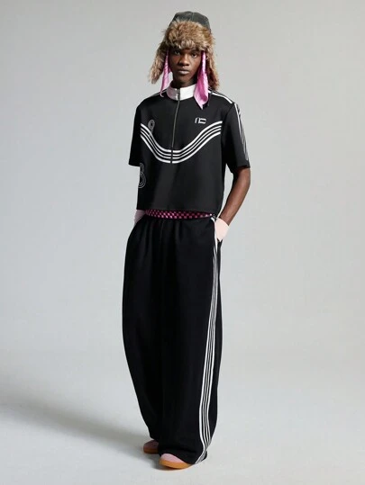 NEON BLANC Men's High Collar Half Zip Embroidered Numeric Knit Sport Baseball T-Shirt - Black - View 1