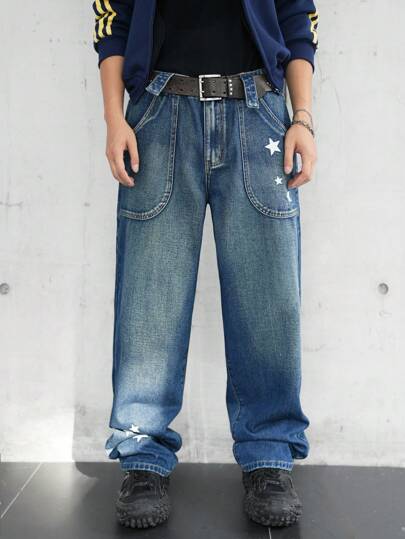 Manfinity EMRG Men's Star Print Pocket Casual Loose Fit Jeans - Blue - View 1