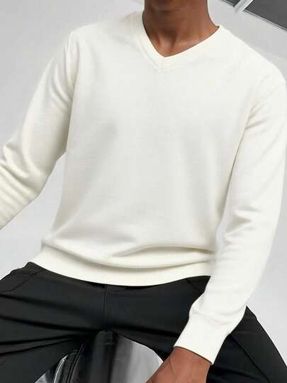Men's V-Neck Long Sleeve Sweater, Versatile Everyday Knitwear - White - View 1
