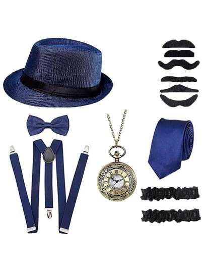 Men 1920s Accessories For Women Reverse Role Playing 1920s Men Costume  Halloween 1920s Accessories For Men Roaring 20s With Pocket Watch/Fake Moustache/Fedora Hat For Men, Blue - Blue - View 1