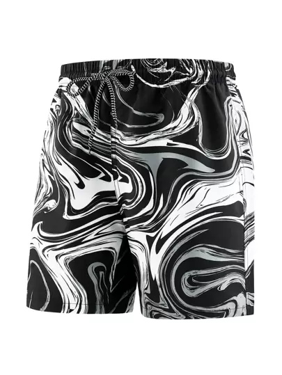 Manfinity Men Marble Print Drawstring Waist Swim Trunks - Black and White - View 1