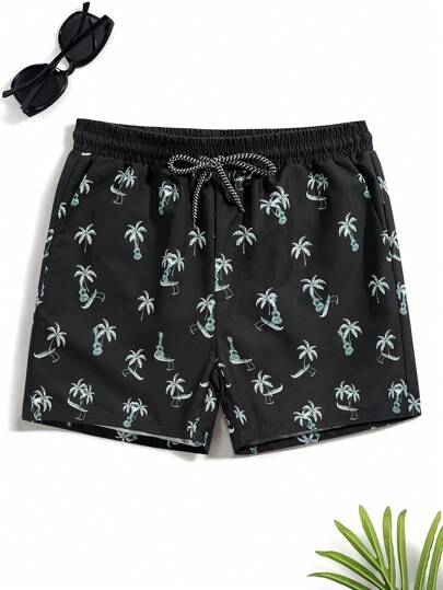 Manfinity Men Coconut Tree Print Drawstring Waist Swim Trunks - Black - View 1