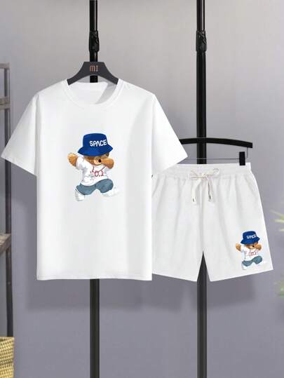 2pcs/Set Men's Cartoon Bear Print Round Neck Short Sleeve T-Shirt And Drawstring Waist Shorts, Casual - White - View 1