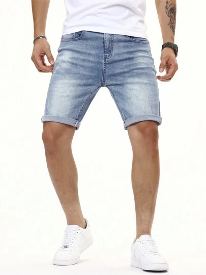 Manfinity Homme Men Cotton Cat Whisker Washed Denim Shorts - Light Wash - View 1