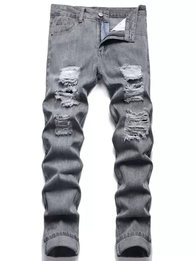 Men Cotton Ripped Frayed Slim Straight Jeans - Grey - View 1