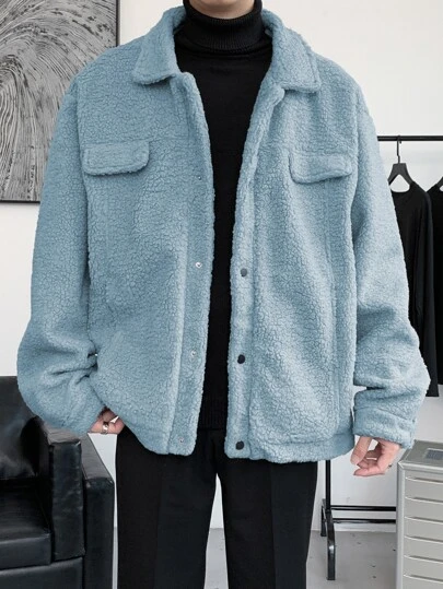 Manfinity Hypemode Men Drop Shoulder Flap Detail Teddy Jacket - Dusty Blue - View 1