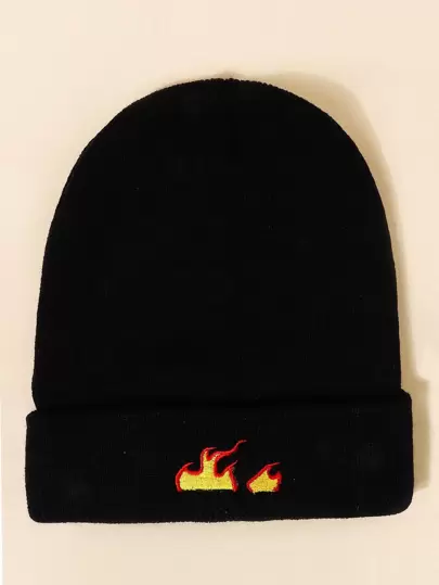 Men Fire Embroidery Cuffed Beanie - Black - View 1