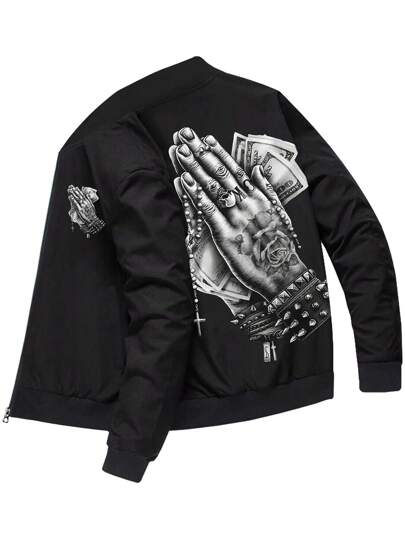 Men's Long Sleeve Rave Jackets, New Spring And Autumn Sports Jackets, Casual Outdoor Running, Fashionable And Personalized Zipper Jacket, Retro European And American Street Style, Money First Prayer Print Men's Long Sleeve Jacket, Suitable For Casual Wear, Sports, Running, Outdoor Activities, For Halloween - Black - View 1