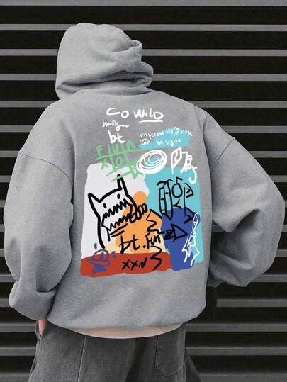 Men Letter & Cartoon Graphic Drop Shoulder Drawstring Hoodie - Grey - View 1