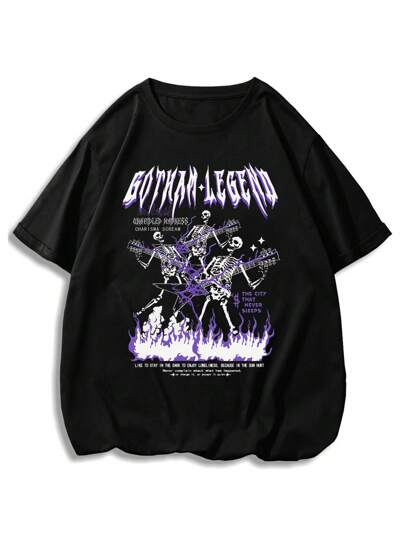Men Letter & Skull Print Tee, For Halloween - Black - View 1