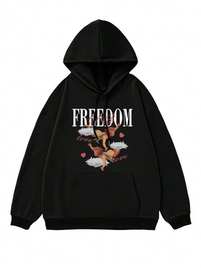 Men Plus Slogan & Cartoon Graphic Kangaroo Pocket Drawstring Thermal Hoodie - Black - View 1