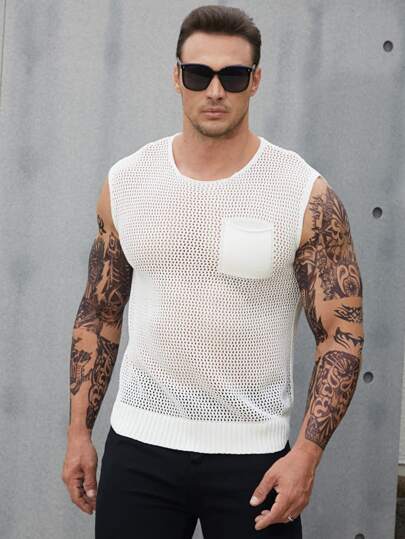 Men Pocket Patched Pointelle Knit Top - White - View 5
