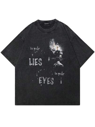 Men's Letter And Character Printed T-Shirt, Breathable, Absorbs Sweat - Black - View 1