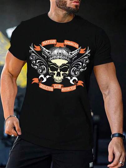 Men Skull & Letter Graphic Tee, For Halloween - Black - View 1