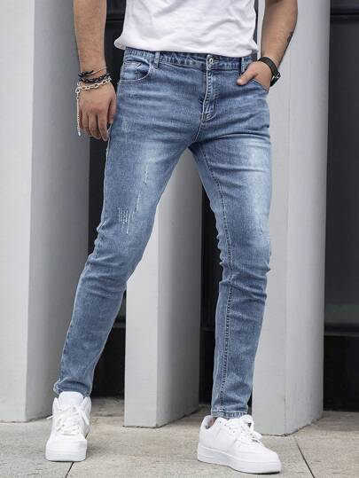Men Slant Pocket Cat Scratch Jeans - Medium Wash - View 6
