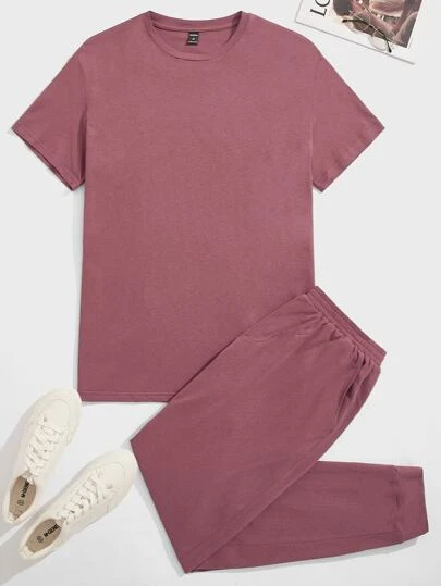 SHEIN Men Solid Tee & Pants Lounge Set - Rose Red - View 1