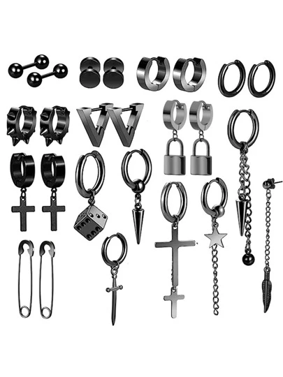 Men's Black Cross Pendant Earrings, 25 piece stainless steel long chain pierced ring earring set, suitable for both men and women, stainless steel, gemstone free - Black - View 1