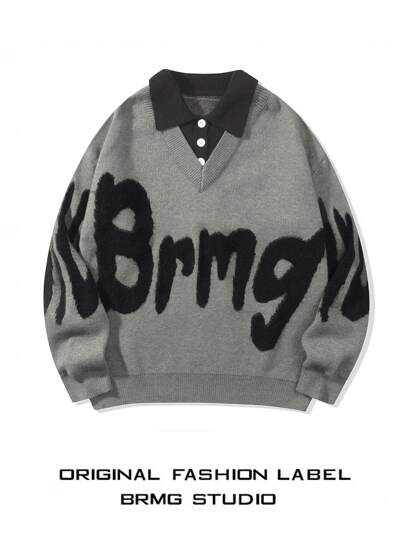 Men's Casual Patchwork Polo Collar Pullover Sweater, Loose Fit College Style, Spring/Autumn, Long Sleeve Top - Grey - View 1