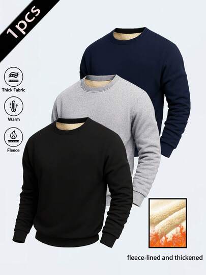 Men's Casual Thermal Lined Warm Crew Neck Sweatshirt, Autumn/Winter - Black - View 1