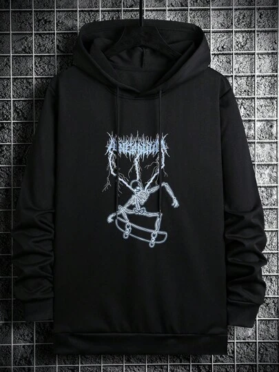 Men's Letter & Skull Printed Hoodie - Black - View 1