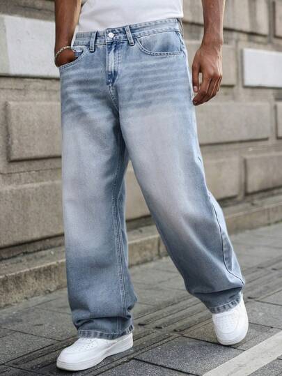 Men's Light Blue Denim Jeans, Casual Loose Straight Leg Y2K Denim Pants, American Streetwear - Blue - View 1