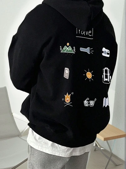 Men's Outdoor Adventure Element Print Drawstring Hoodie Sweatshirt, Back To School, Autumn/Winter, Long Sleeve Top - Black - View 1
