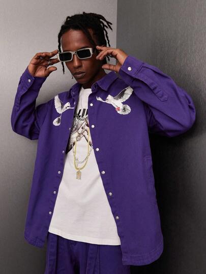 Manfinity Roghcode Men's Loose-Fit Denim Shirt With Pigeon And Letter Print - Purple - View 1