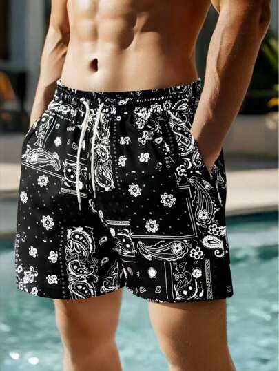 Men's Summer Colorblock Sport Quick Dry Shorts With Drawstring Waist, Casual Leisure Beach Shorts With Paisley Flower Print, Hawaiian - Black - View 1
