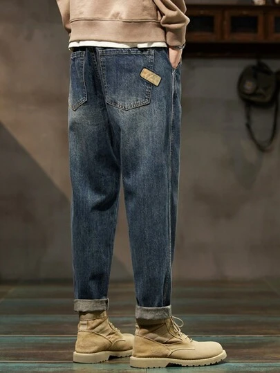 Men's Washeded Denim Jeans With Slanted Pockets - Blue - View 4