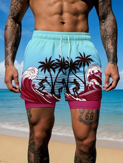 Men's Wave Print Double Layer Casual Beach Shorts - Multicolor - View 1