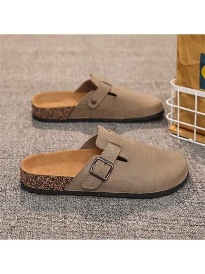 Men's Wooden Slippers, Open-Toe Slides, Slip-On Sandals, Casual Mules, Comfortable Summer Shoes, Couples, Big Size, Office & Leisure - Khaki - View 1