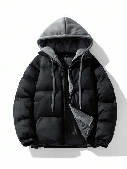 Men's Zipper Front Two-In-One Hooded Padded Coat - Black - View 1